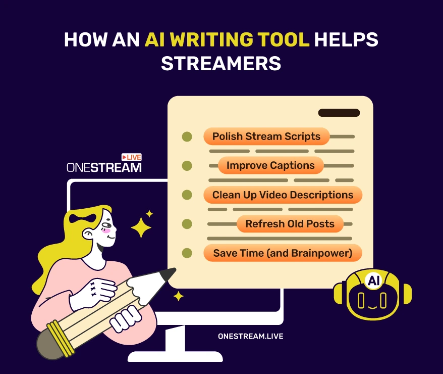 You focus on streaming. Let your tools — and your words — keep up. The AI paragraph rewriter handles the copy. OneStream Live delivers it everywhere you need to be.