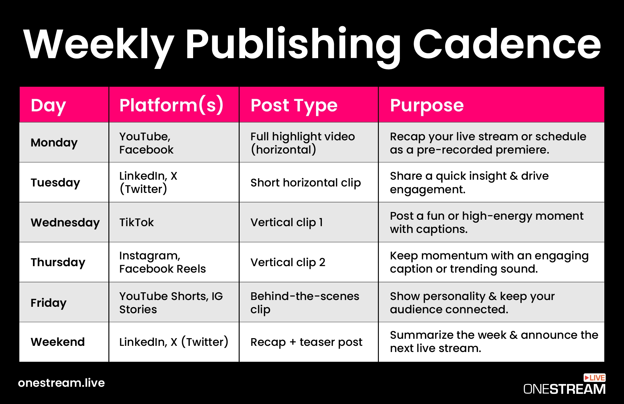 This cadence is just a blueprint, so adjust it based on your audience and platforms. The core idea is spreading out the content to maximize reach. You’re essentially multi-streaming your content across platforms throughout the week, much like how OneStream Live allows you to multistream live video to 45+ platforms simultaneously, except here we’re doing it sequentially with edited content.