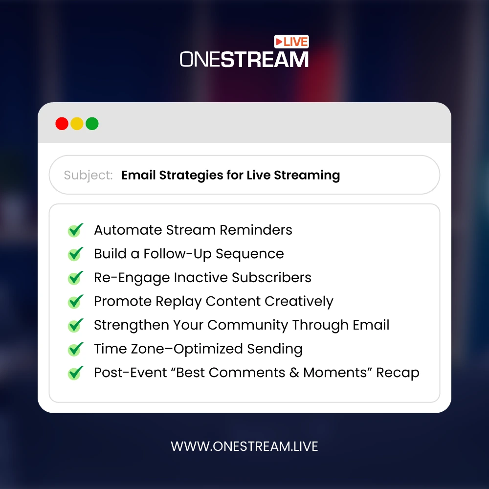 To conclude, a thoughtful email marketing strategy ties your broadcasts together, converting casual viewers into loyal fans who keep showing up. From automated reminders to replay promotions and post-event recaps, email is the one channel you control completely. Social algorithms may bury your posts, but the inbox gives you a direct line.