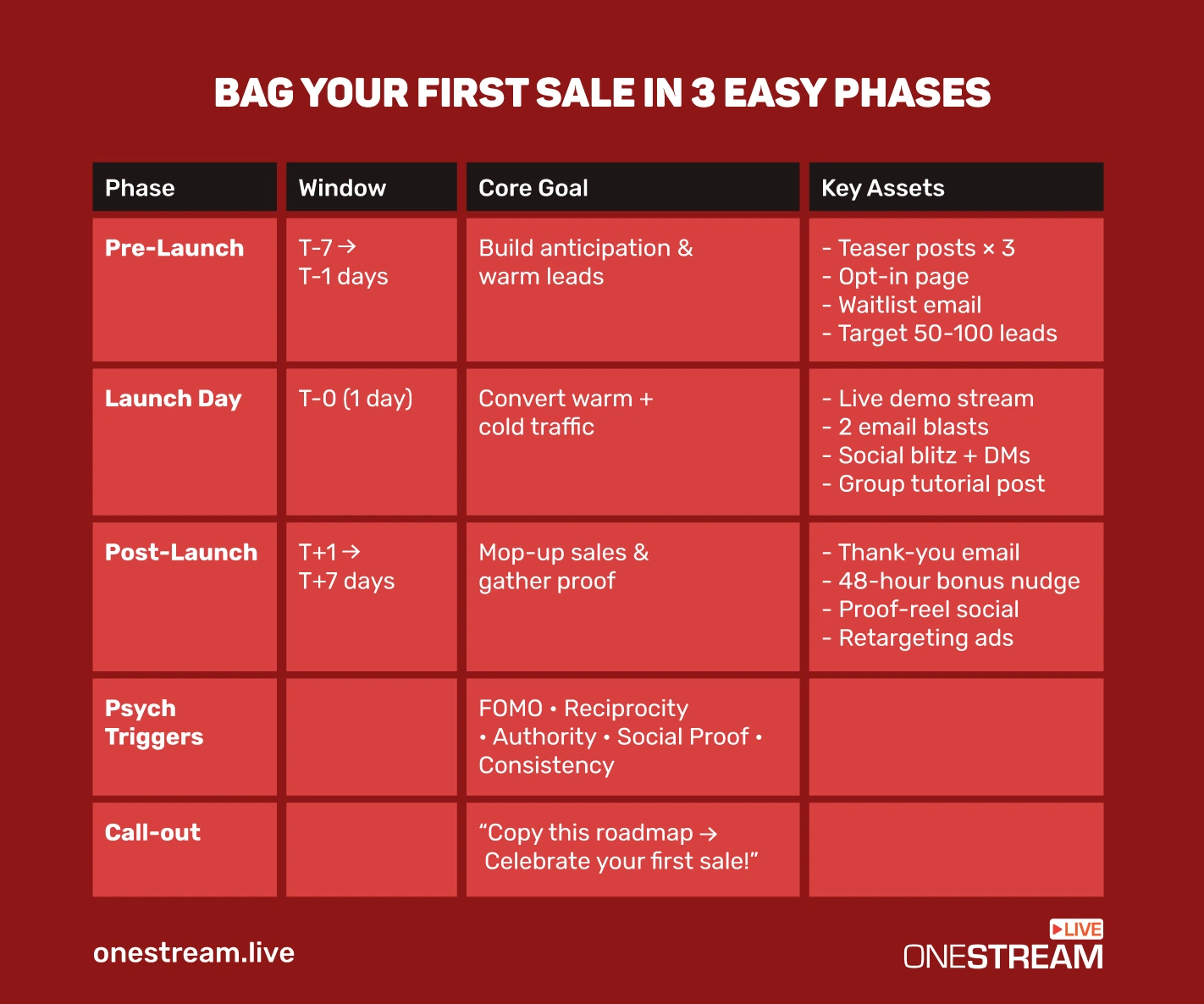 | Proof | Push hot leads over the line | Case studies, income screenshots, testimonial reels | “Case Study: How Pastor Jim Added 2k Viewers Using OneStream Live” |
