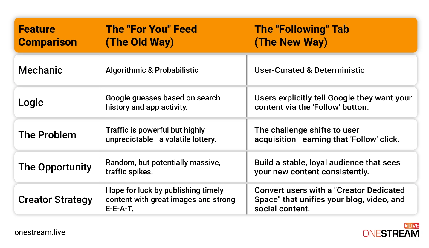 The new Google Discover model is built for the modern, multi-platform creator = the exact person who uses tools like OneStream Live. The system is no longer just about articles; it’s about creators.
