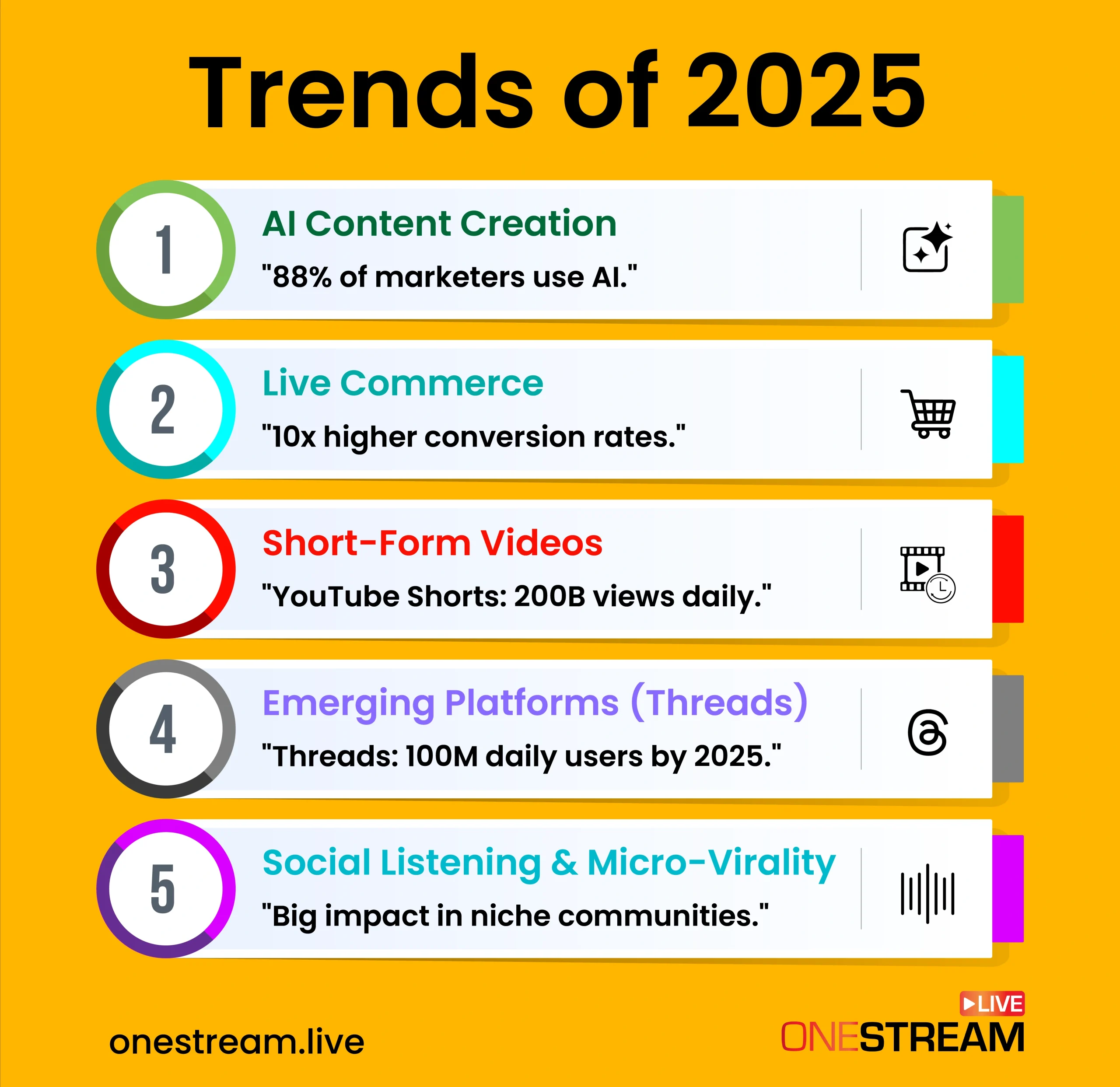 The story of 2025’s social media trends is all about behavior hardening in new directions. AI is silently playing a part in content production, live commerce is finally mainstream, short-form video has stretched into deeper storytelling, and emerging social media platforms like Threads and Noplace have carved out space for authenticity. Meanwhile, social listening now powers micro-virality.