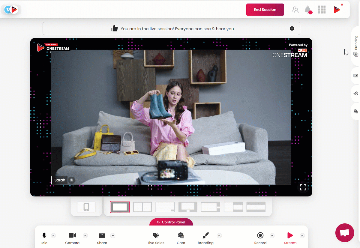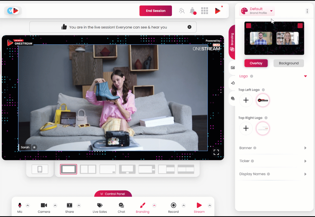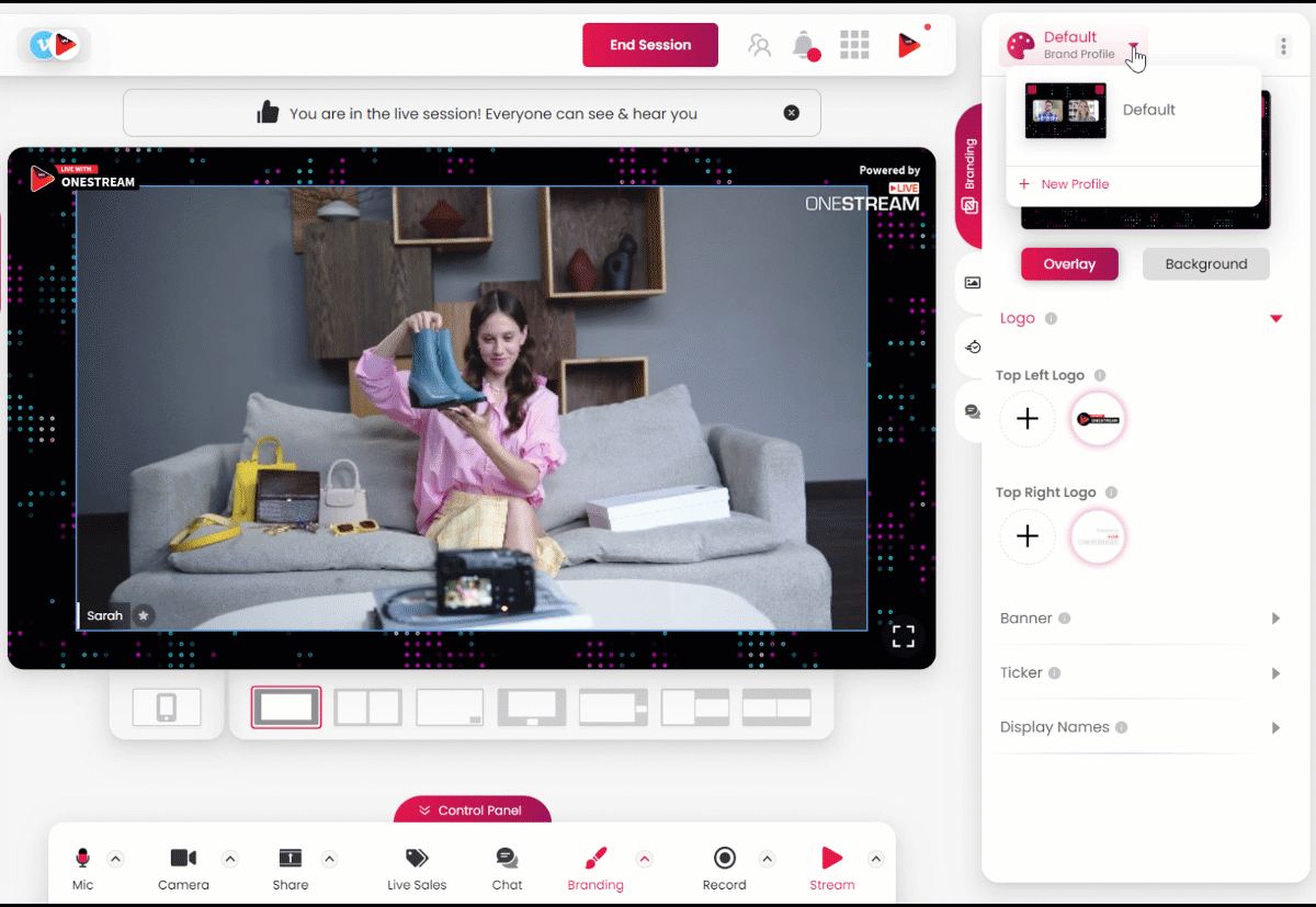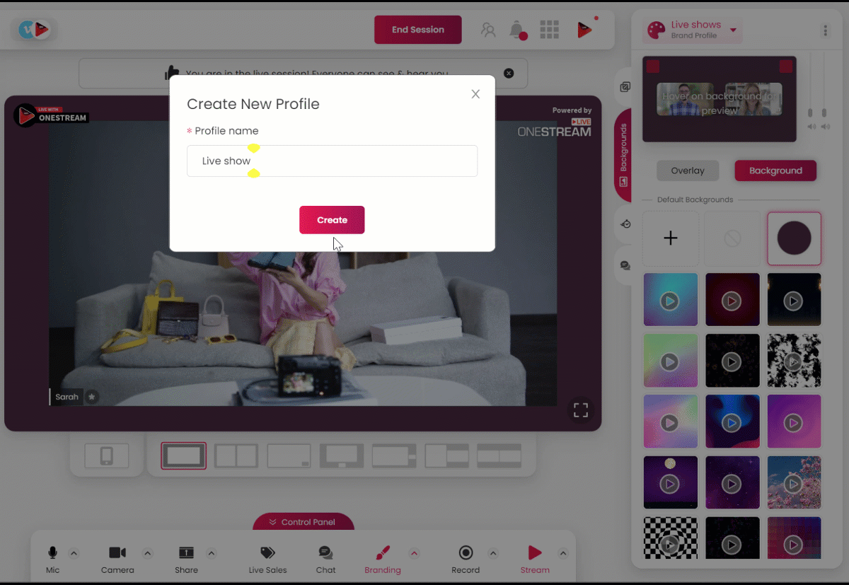 When using OneStream Studio, it can be useful to have separate “ custom profiles” saved to start a session instantly with different background and layout settings. This helps you go live with your favorite background, logo, colors, and fonts without wasting time creating your desired layout for the live show.