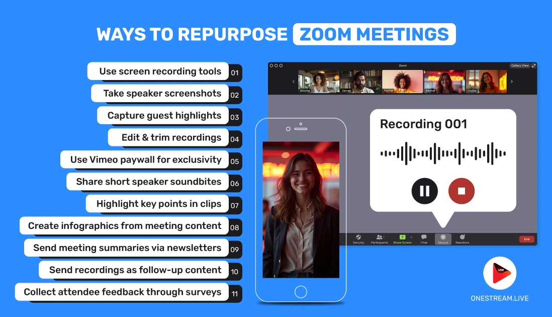 Recording Zoom meetings is just the beginning. With a smart repurposing strategy and tools like OneStream Live, you can: