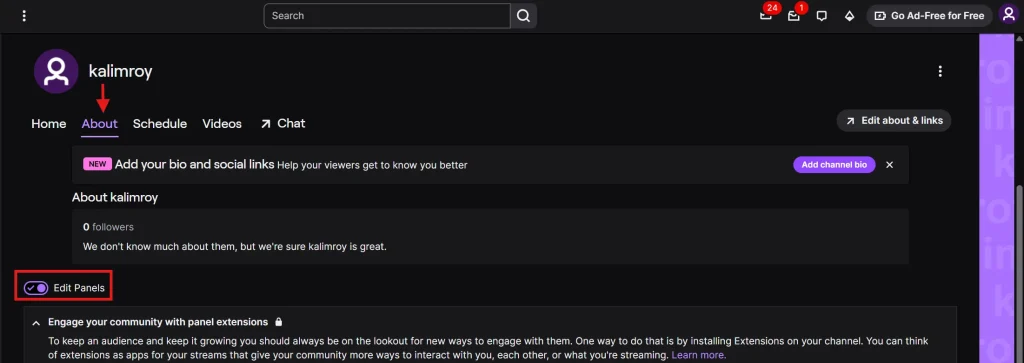 Now, integrate that donation link into your Twitch channel profile. On a computer, go to your Twitch channel page and click the “About” tab.