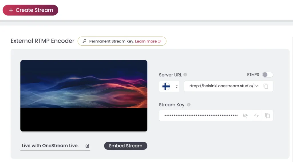 In the OneStream Live dashboard go to RTMP Encoder and select Connect OBS, etc, & go Live. OneStream Live will show you an RTMP Server URL and a Stream Key.
