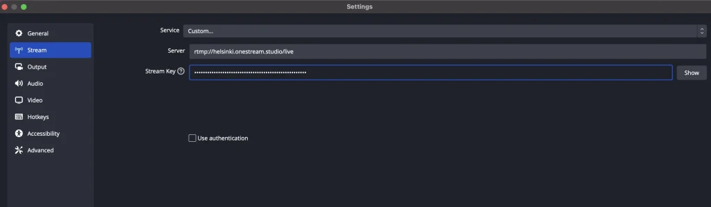 Open OBS and go to Settings > Stream. Choose Custom as the service. Paste the RTMP URL and Stream Key from OneStream Live. This connects OBS to OneStream.