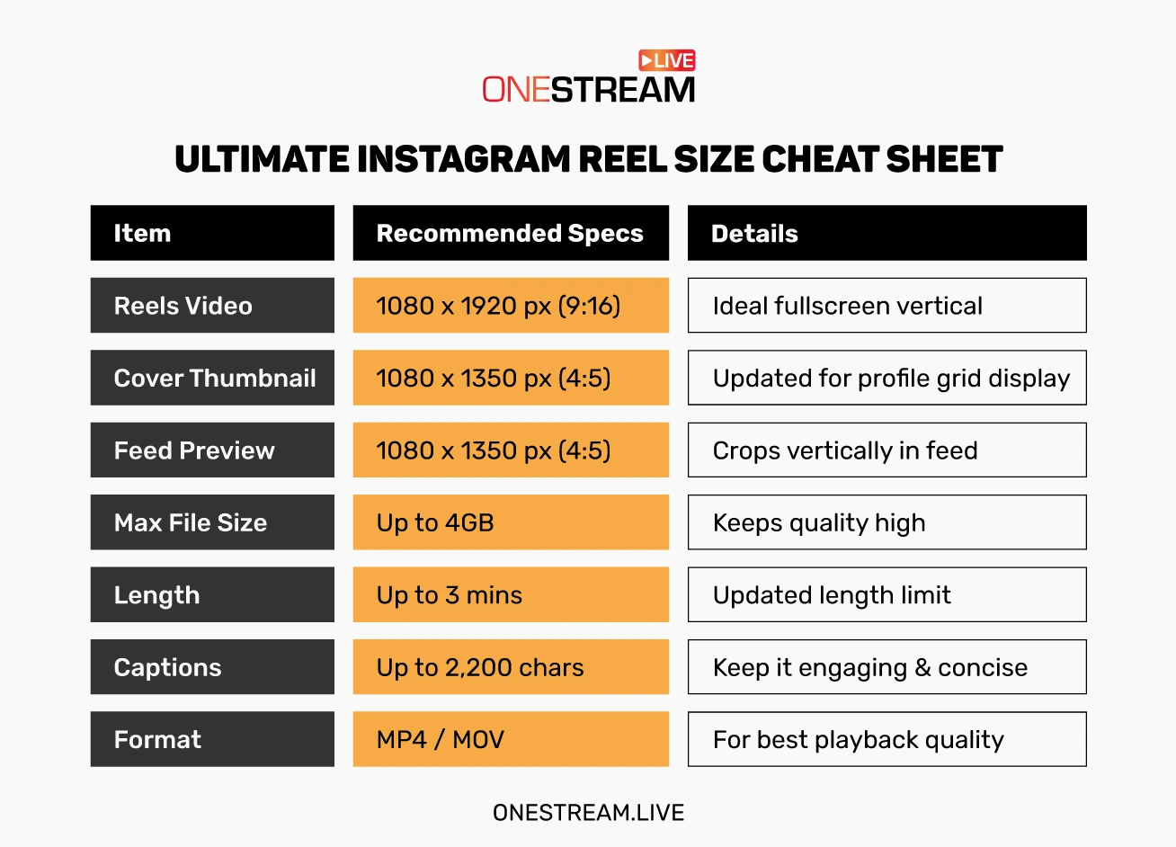 This cheat sheet is a quick reminder for the recommended Instagram Reel dimensions you need to keep in mind.