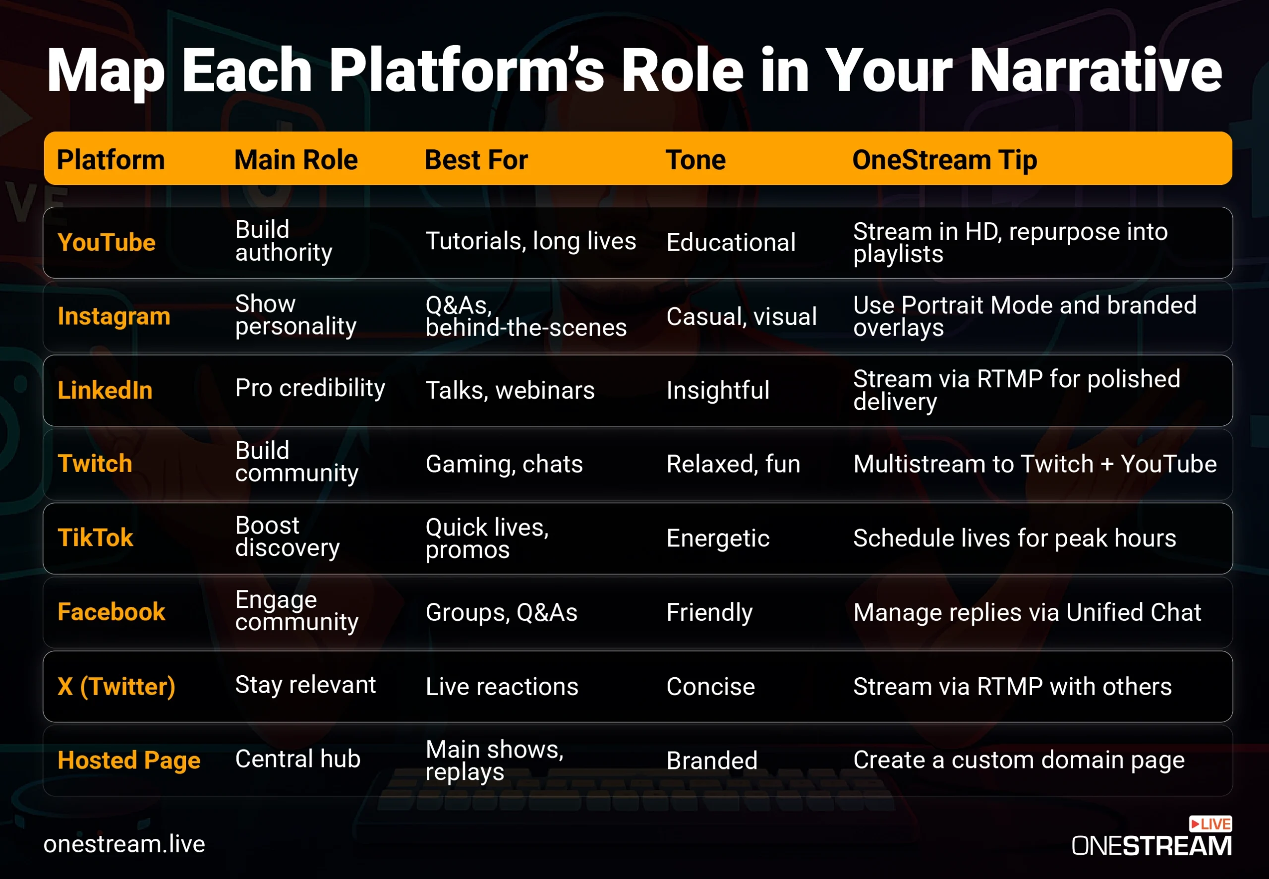 But simply showing up everywhere isn’t enough. Without a plan, you risk creating a fragmented experience that confuses your audience and dilutes your brand message. That’s why the most successful creators focus not just on the technical act of streaming to multiple platforms, but on the art of cross-platform storytelling.
