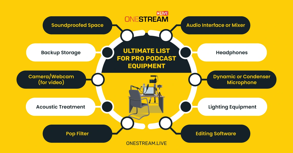 As many podcasters like to say, “People will forgive poor video, but no one will forgive poor audio.” In this comprehensive guide, we’ll answer the most burning questions around podcast gear, recommend the best equipment for content creators, and show you how to streamline your podcast setup using the powerful features of OneStream Live.