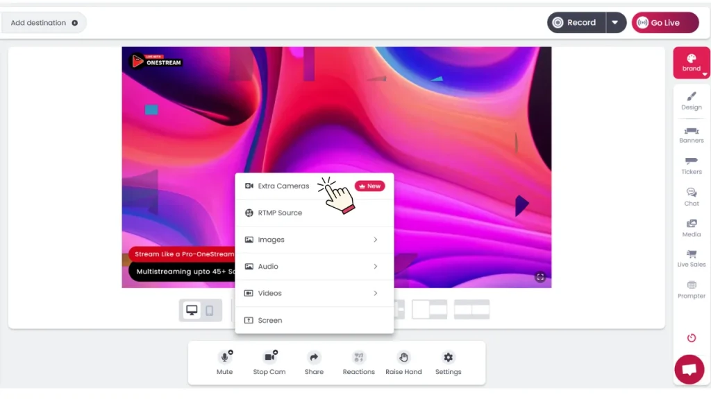 1. In your OneStream Studio, at the bottom of the studio panel, click the Share button. A menu will appear – choose Extra Cameras. OneStream Live will display a list of all camera devices connected to your computer.