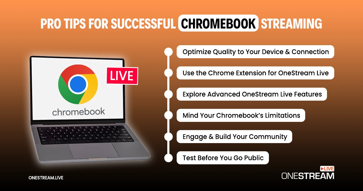 OneStream Live will handle a lot automatically, but you have some control. If you notice any performance issues (e.g., your Chromebook’s fan is loud, or the video is stuttering), consider streaming at a slightly lower resolution or bitrate.