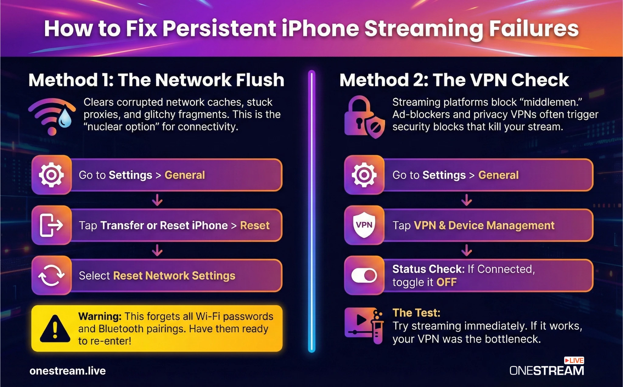 Before we tear apart your network settings, let’s triage the situation. iPhone streaming issues generally fall into two buckets: Consumption (you can’t watch YouTube/Netflix/Twitch) and Creation (you can’t broadcast via OneStream Live, Instagram, or TikTok).