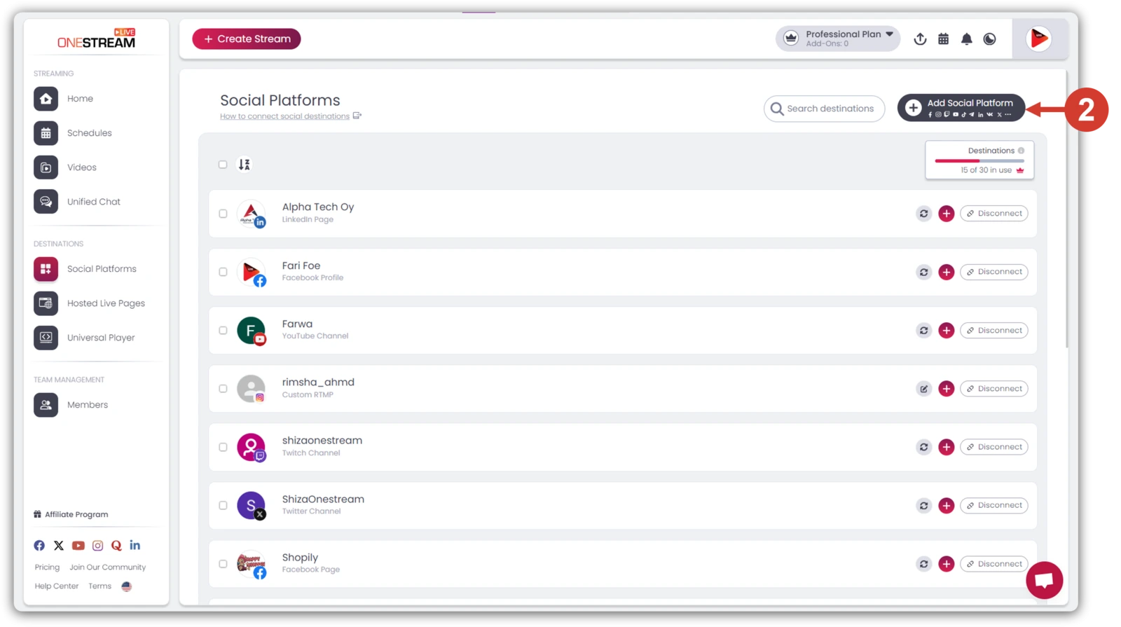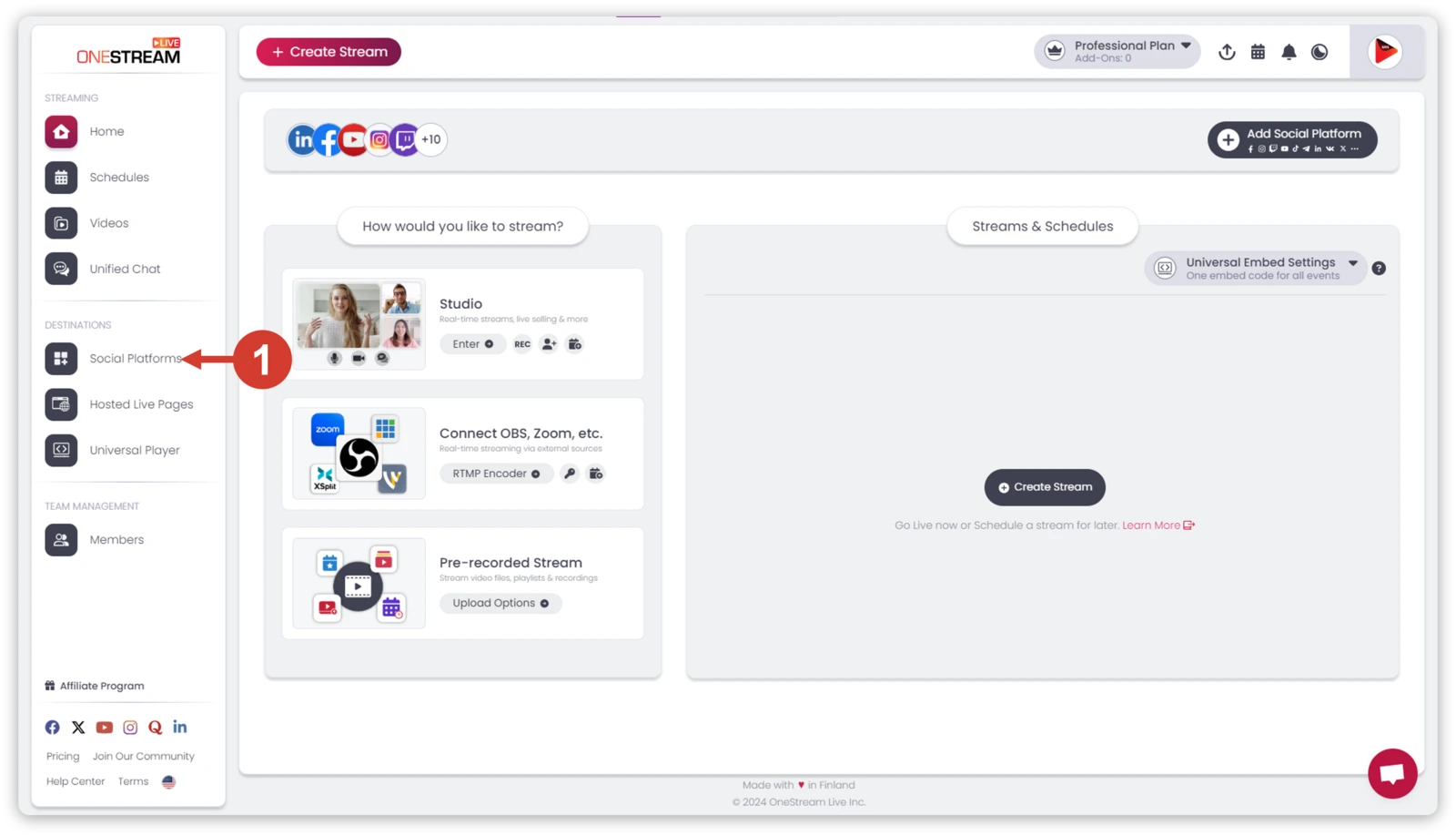 1. From OneStream Live homepage, click Social Platforms, then select Add Social Platform and Connect.