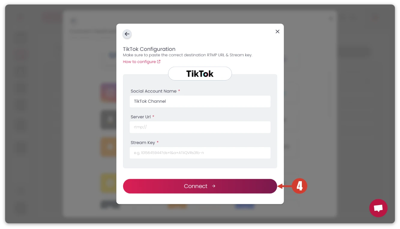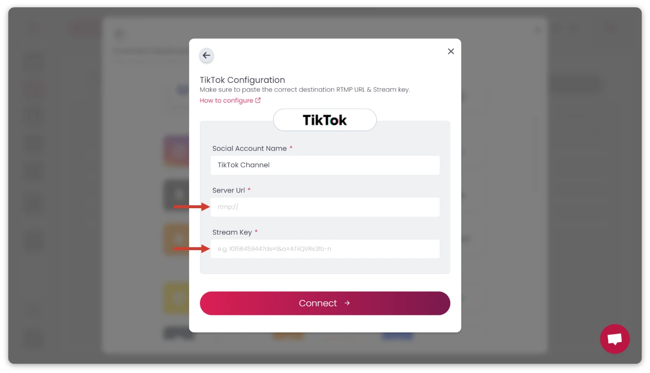 4. Paste the Server URL and Stream Key copied from TikTok in their respective fields.
