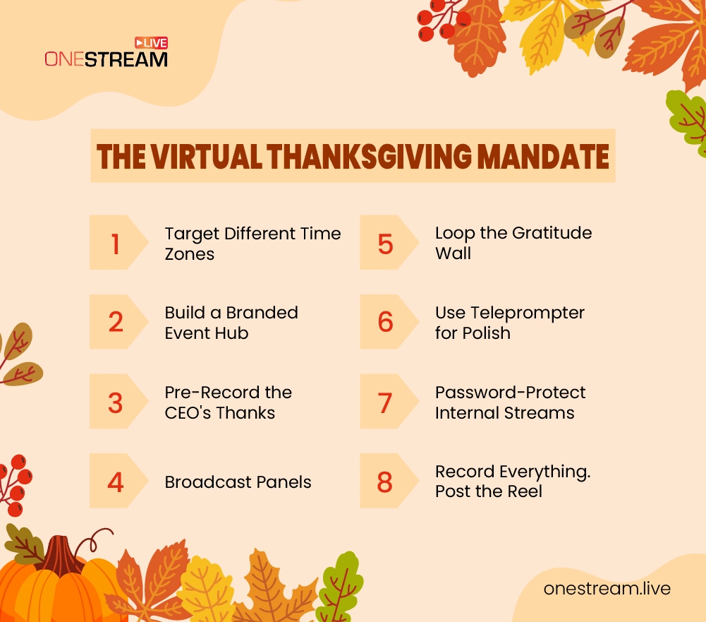 Great ideas can be ruined by bad tech. Demonstrating “how” to run a smooth event for virtual Thanksgiving activities is key to building trust and showing expertise. Here is a first-hand technical checklist for a seamless production.