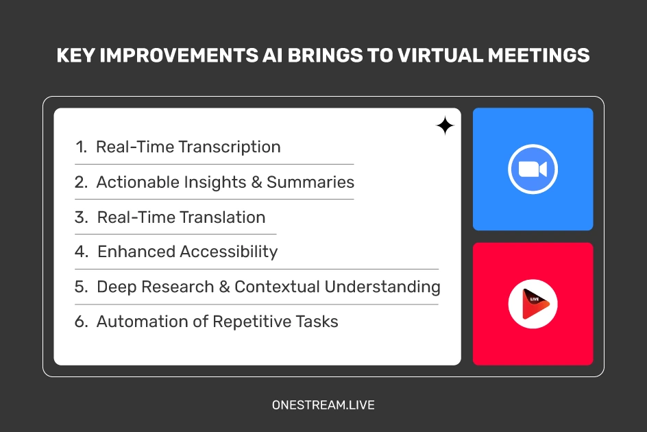 From AI meeting assistants to platforms like OneStream Live, which let you multistream Zoom sessions across multiple platforms, we’re witnessing a reinvention of online collaboration. This guide explores how AI is changing everything from real-time transcription to multilingual accessibility. Let’s start!